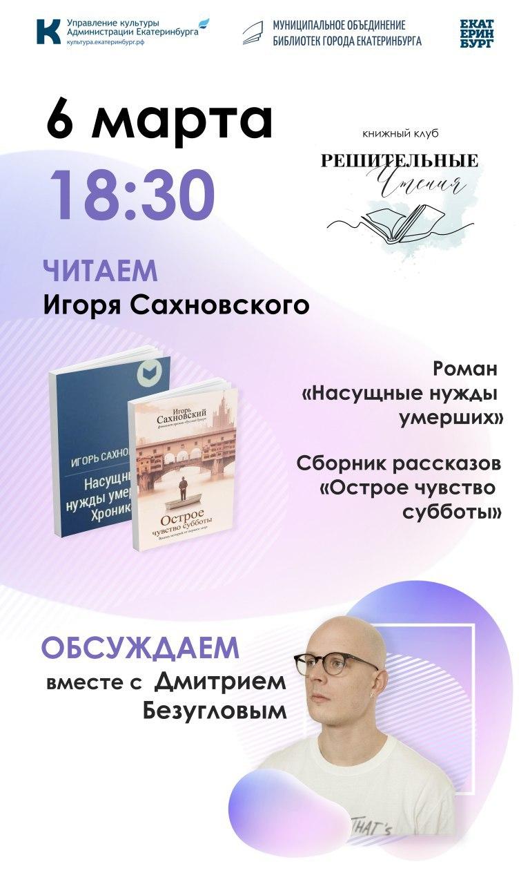 Первым приглашённым гостем будет Дмитрий Безуглов – журналист, переводчик и куратор интеллектуальной платформы Уральской биеннале современного искусства. Вместе с Дмитрием предлагаем вам обратиться к произведениям уральского поэта и писателя Игоря Сахновского – роману «Насущные нужды умерших» и сборнику рассказов «Острое чувство субботы: Восемь историй от первого лица».